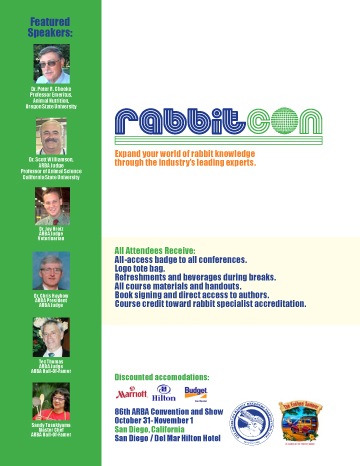 The Rabbitcon sessions will be held at the Hilton Hotel at the fairgrounds. Admission to the conference sessions will be available to attendees who upgrade to special conference badges. The badges will provide unlimited admission to any or all of the conference sessions scheduled over the weekend. Please watch this page for speaker bios, course descriptions, registration cost, schedule and other details. The conferences are held on the weekend prior to the show, October 31-November 1. Please review the convention catalog and plan out your week as there are many events and activities. It may not be possible to participate in every activity.